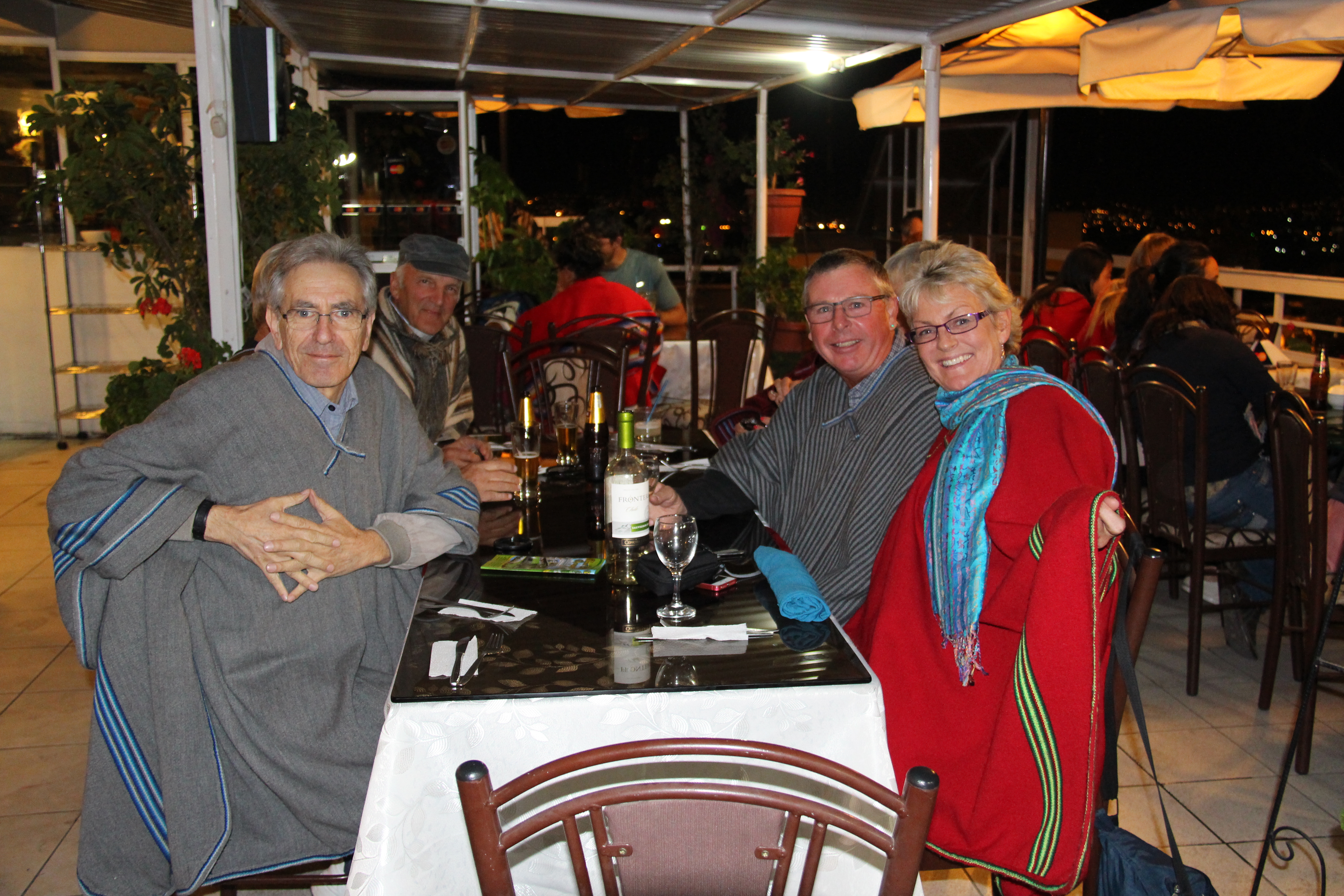 Bill, Vaughan, Steve and me in ponchos at the rooftop restaurant, Arequipa