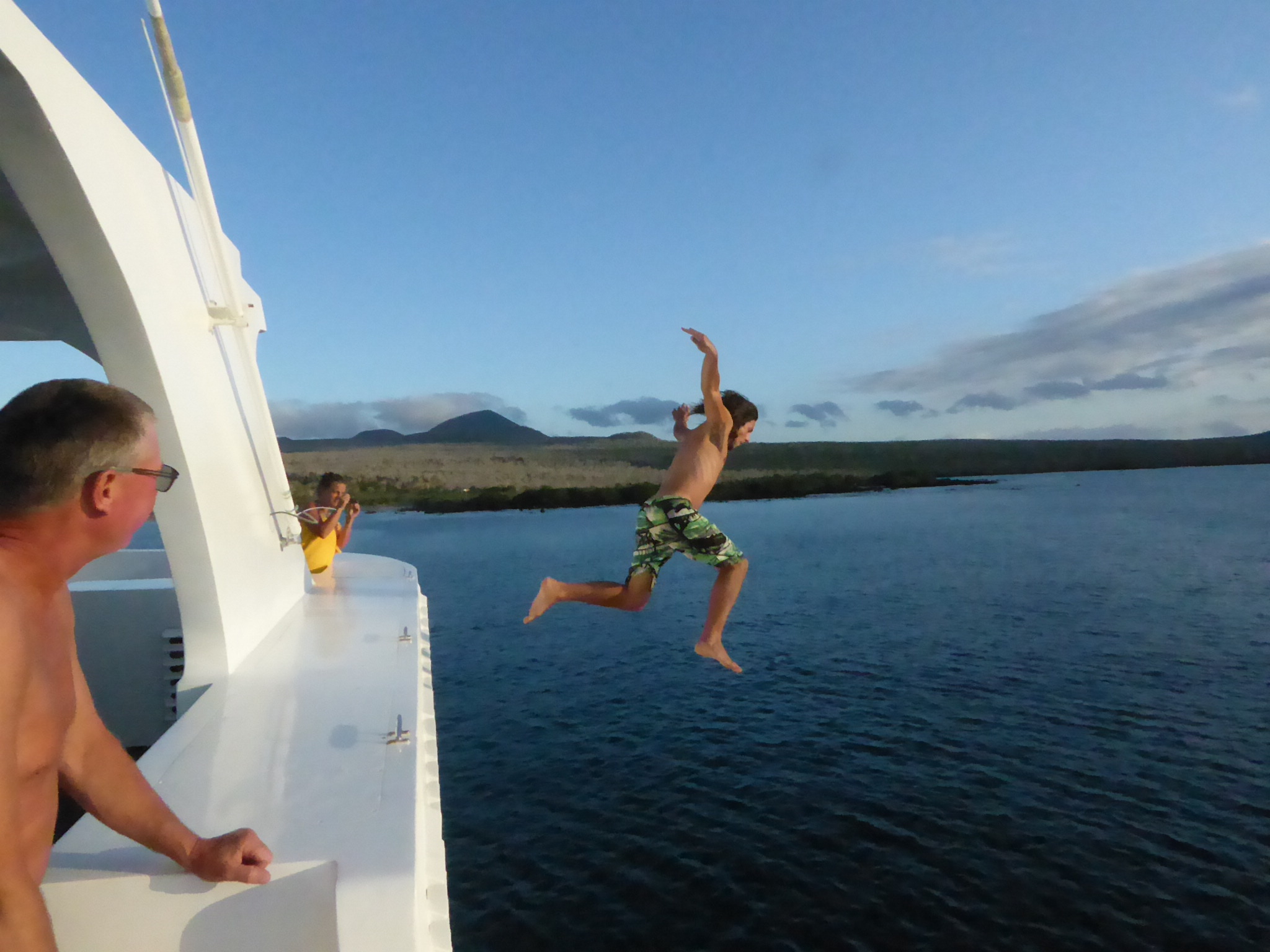 Yves jumping off the top deck of the catamaran