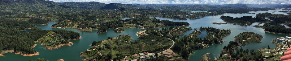 Guatapé is on the shores of the Embalse Guatapé a huge man-made lake, and is famous for two things: the colourful bas-relief frescos of animals, plants and village scenes which are painted on the bottom half of most walls around the village and the Piedra del Peñol, a huge granite monolith outside Guatapé which has had a series of 750 stairs, built into a crevice in the rock, on which you huff and puff up to the tower at the top. Also at the top of the rock are a couple of cafés, souvenir shop, proper flushing toilets with seats (a rare and treasured sight anywhere we’ve been) and one of the most breathtaking 360 degree views I’ve ever seen, over the lake and all its many inlets and little islands. A cold beer at the top of that rock never tasted better. I don’t know if the photos will really do justice to it, because you can’t really get a sense of the full 360 degree view.